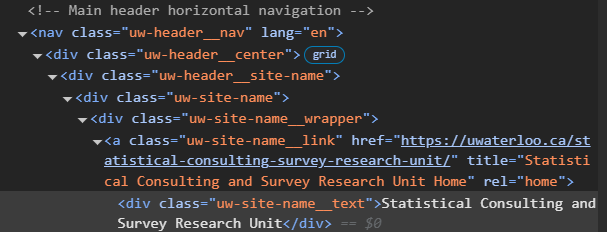 , and so forth. In conjunction, these codes allow navigation of the html code to specific elements on the page which can then be analyzed for the desired data. For example on the SCSRU website, one element with the main title has a unique class ’uw-site-name__link’.